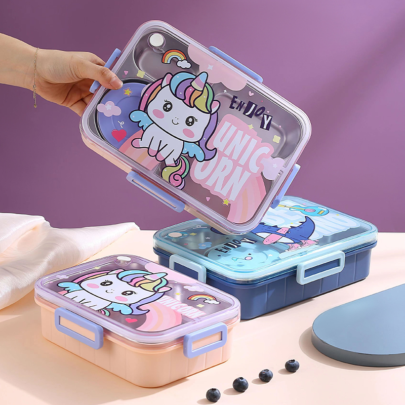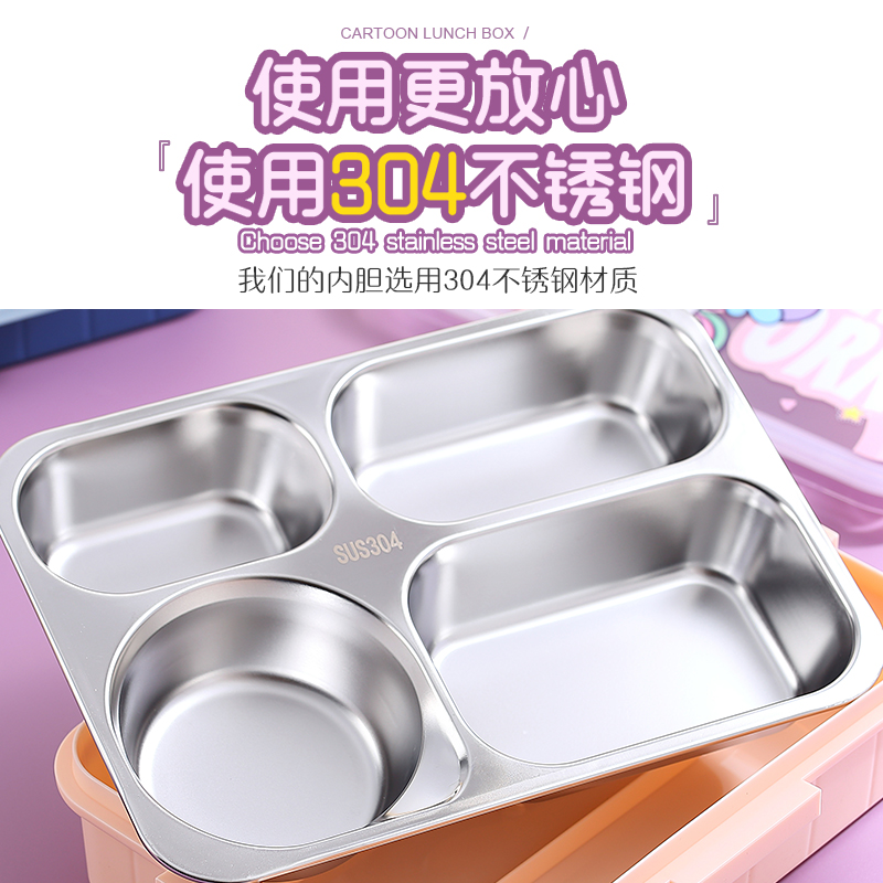 2534-900ml independent sealed leak proof stainless steel lunch box (cartoon four compartments+bowl 150ml stainless steel spoon and chopsticks)