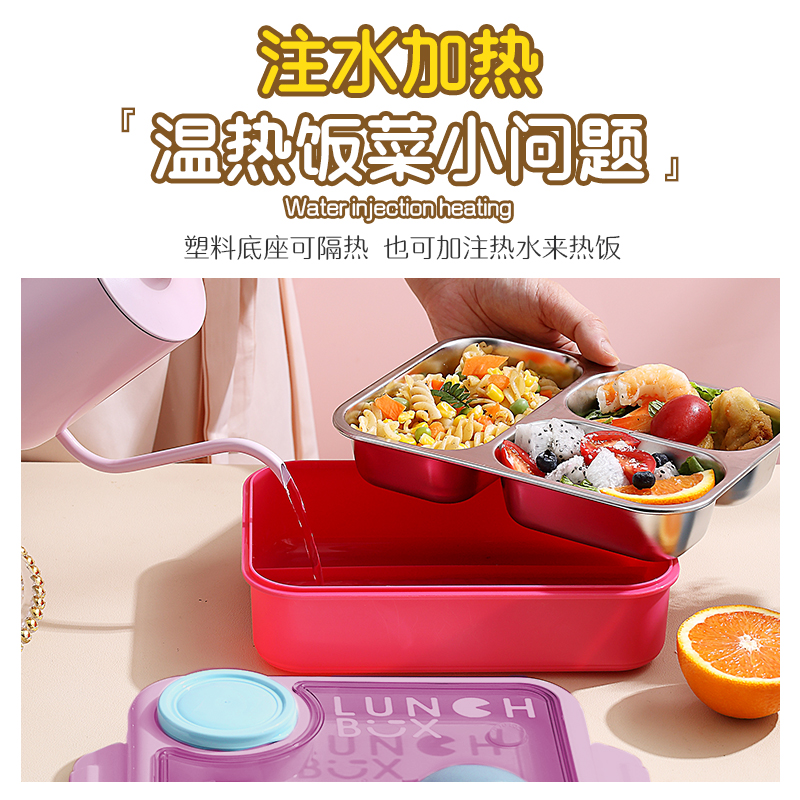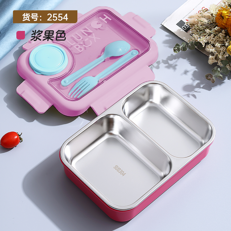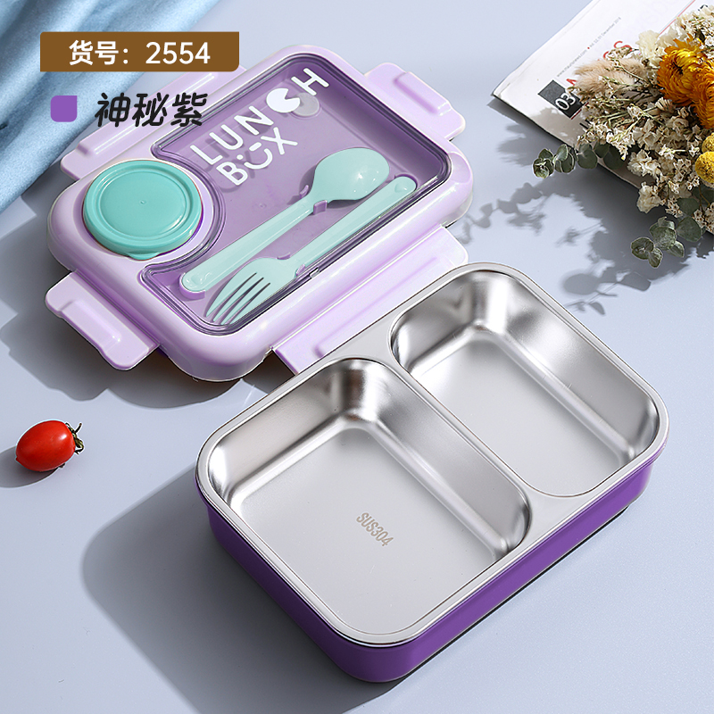 2554-750ml independent sealed stainless steel lunch box 2 compartments+sauce cup 80ml+PP spoon fork