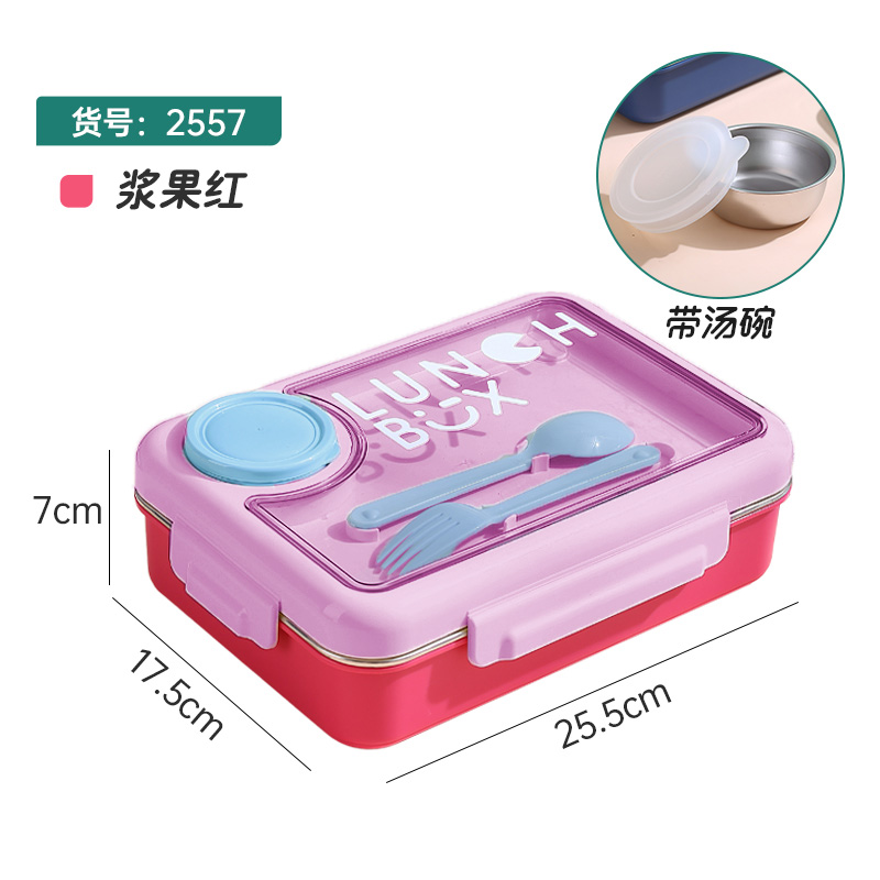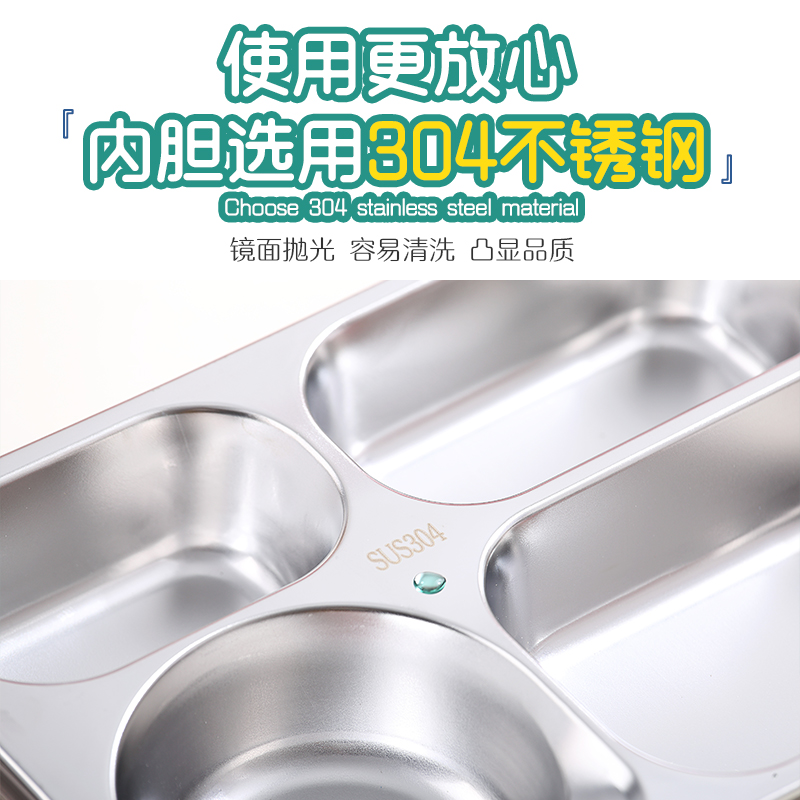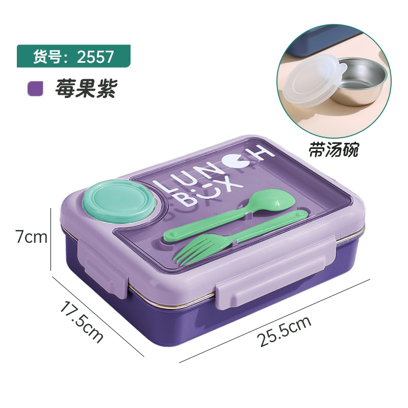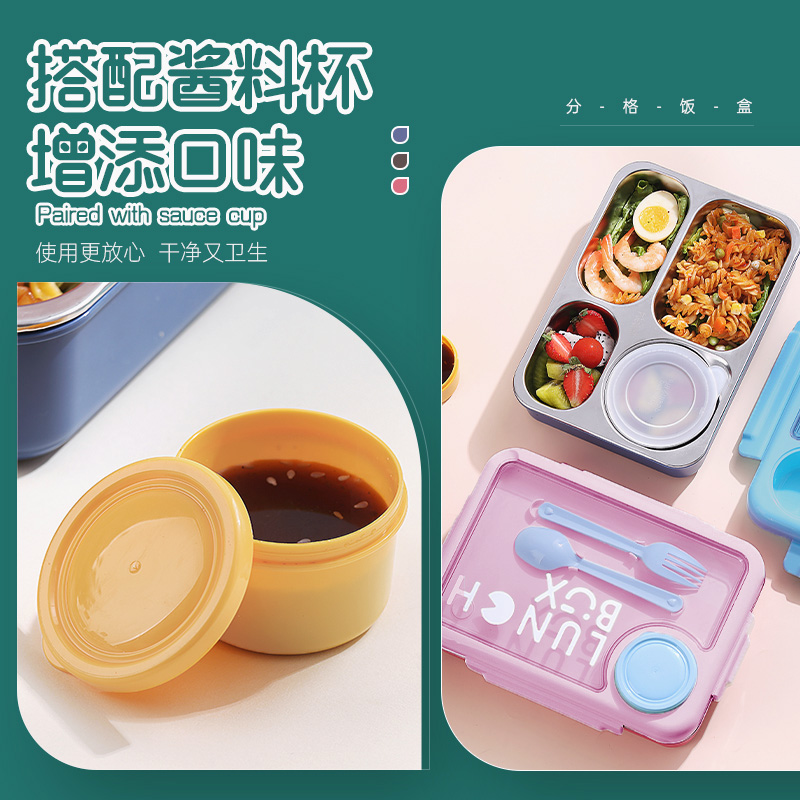 2557-900ml independent sealed stainless steel lunch box with 4 compartments, 150ml soup bowl, 80ml sauce cup, and PP spoon fork