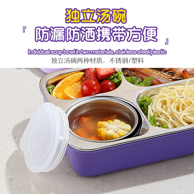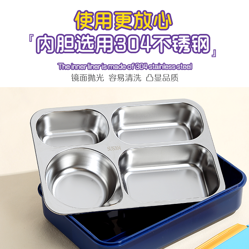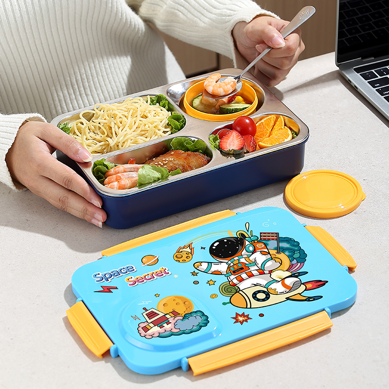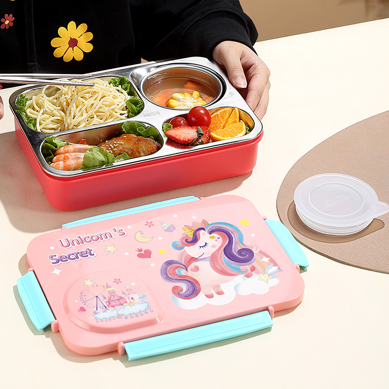 2662-UV printed cartoon leak-proof lunch box (stainless steel 4 grids 900ml+stainless steel bowl 150ml+stainless steel spoons and chopsticks)