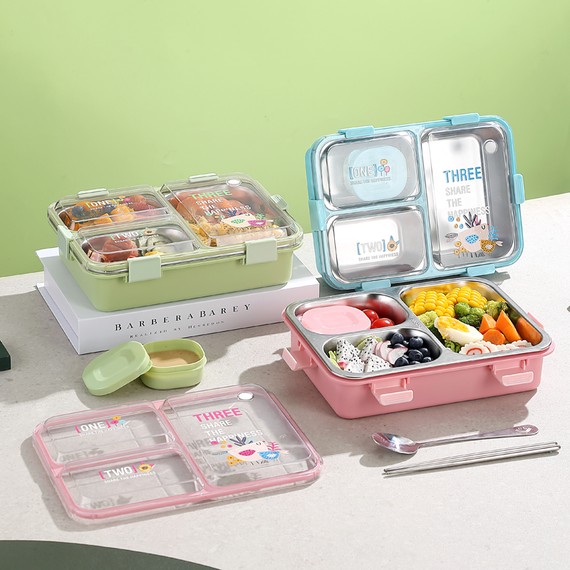 7135-UV printed large three grid sauce box with raised stainless steel lunch box 900+70ml