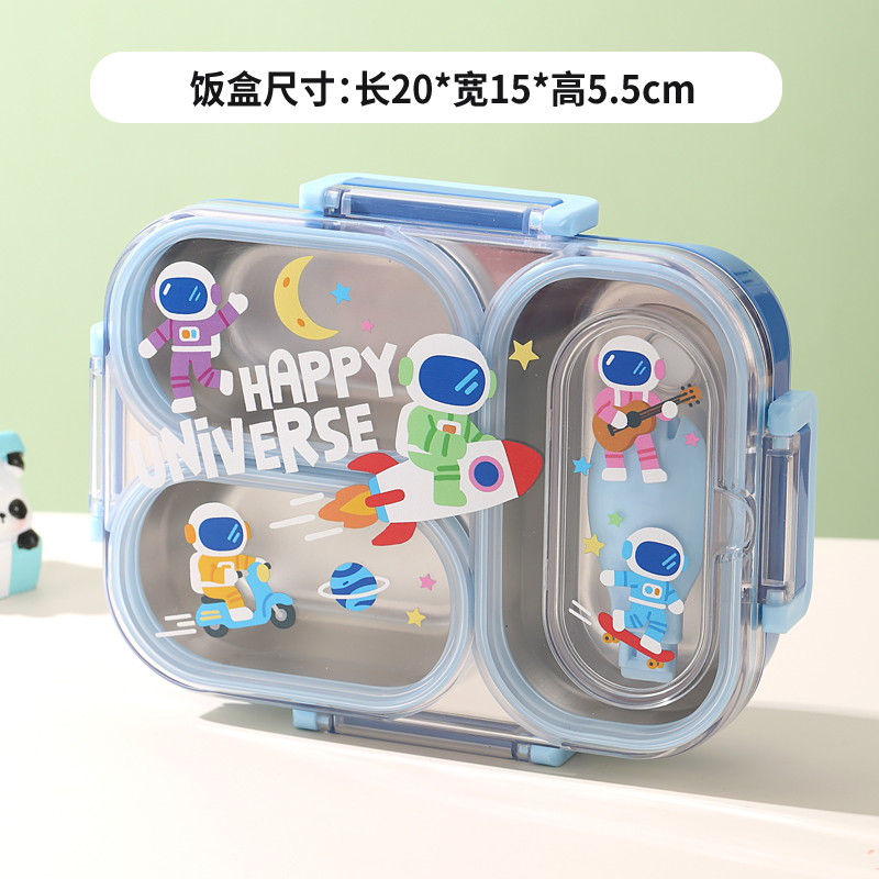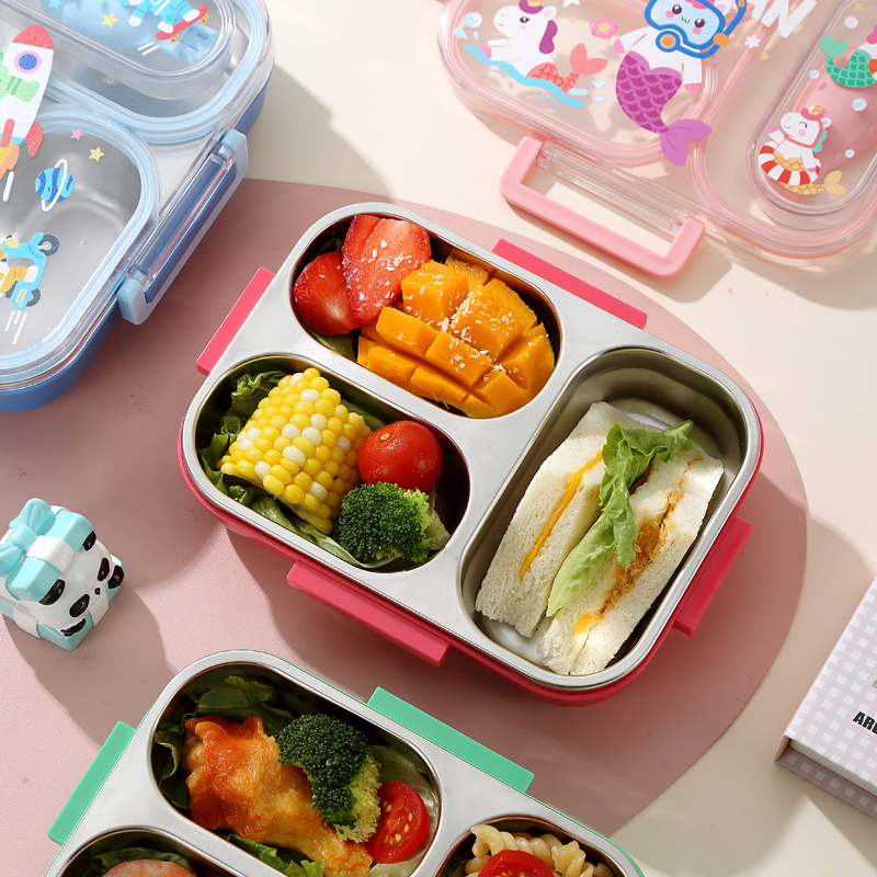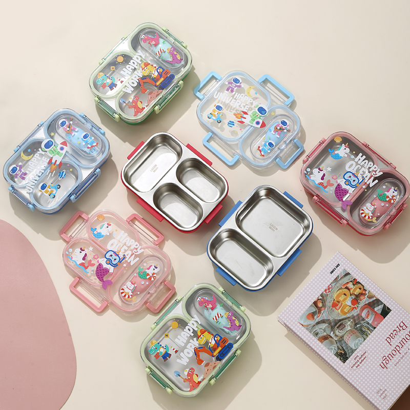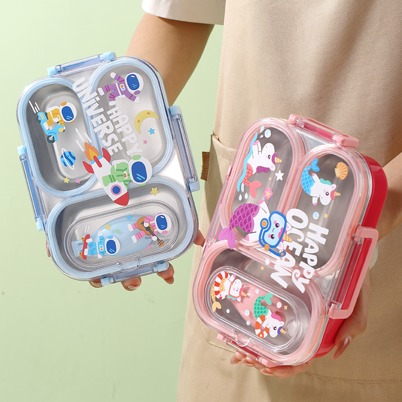 7164-600ml UV independent sealed cartoon stainless steel dining box with 3 compartments (equipped with PP folding spoon)