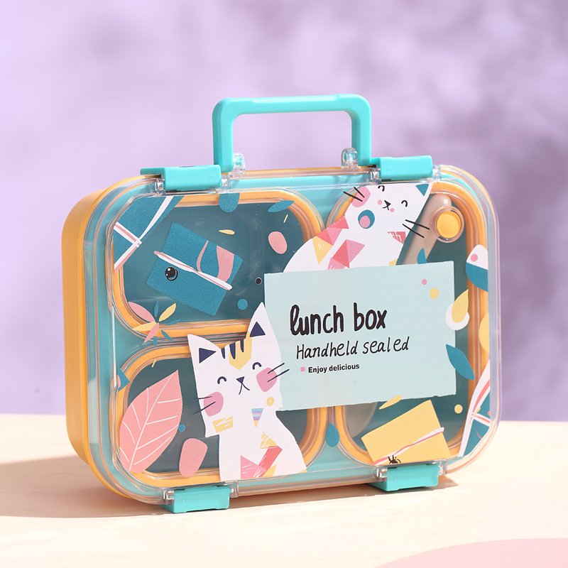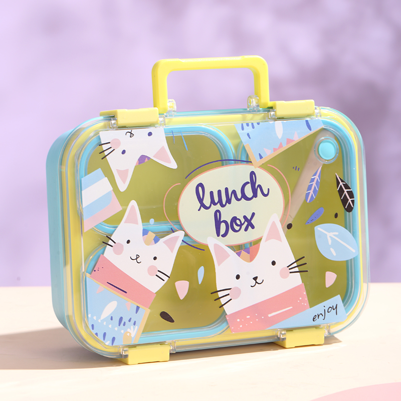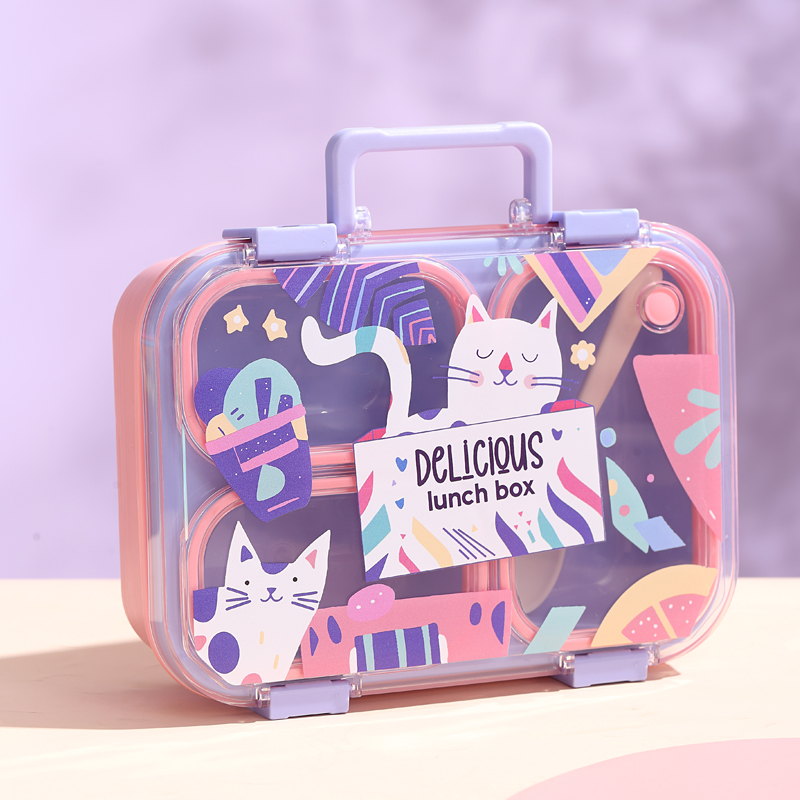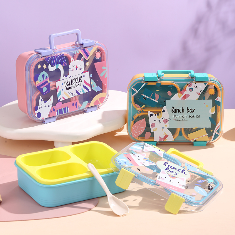 7168-UV Printed Handheld Cartoon Cat individual Sealed leak-proof Three Grid Plastic Meal Box (800ml)