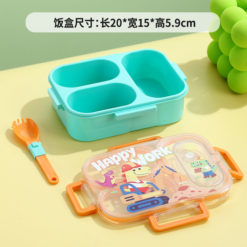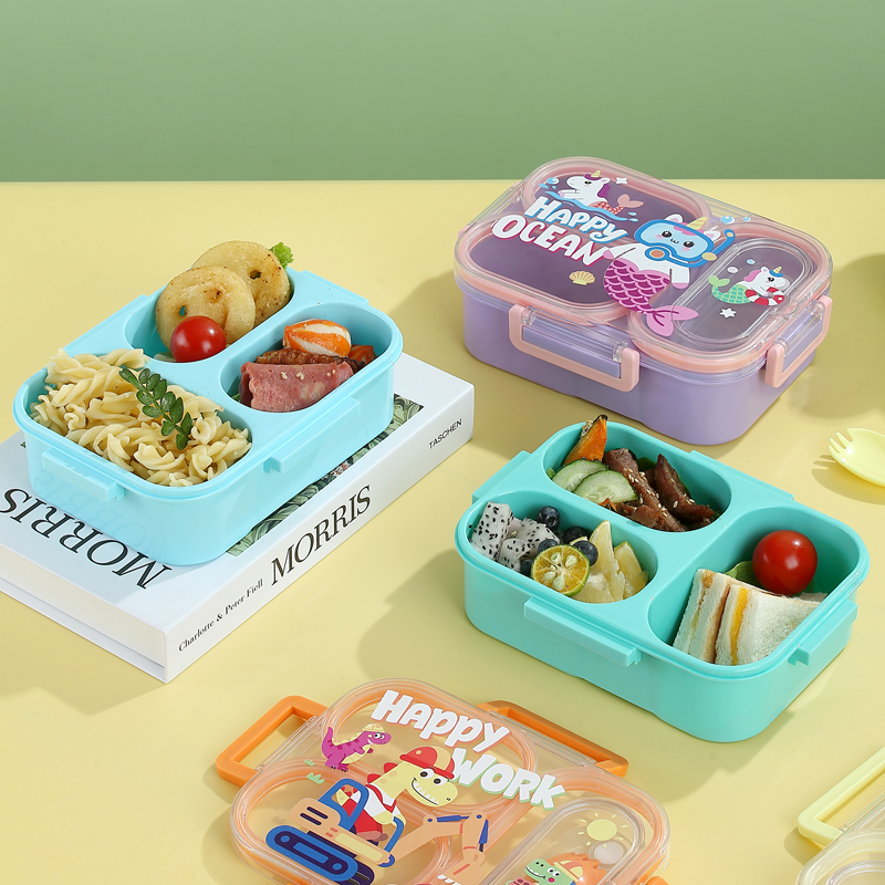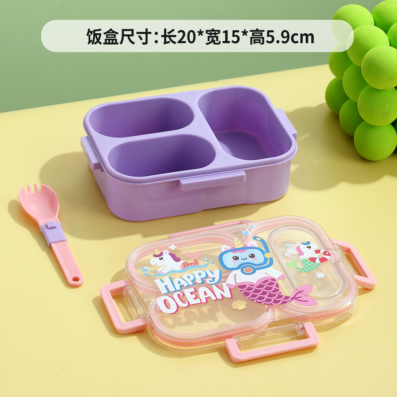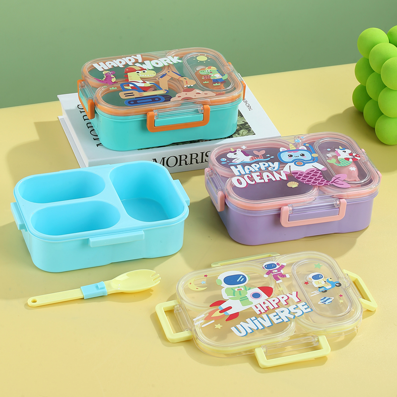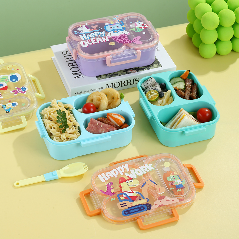 7176-850ml UV independent sealed cartoon plastic lunch box with 3 compartments (equipped with PP folding spoon)