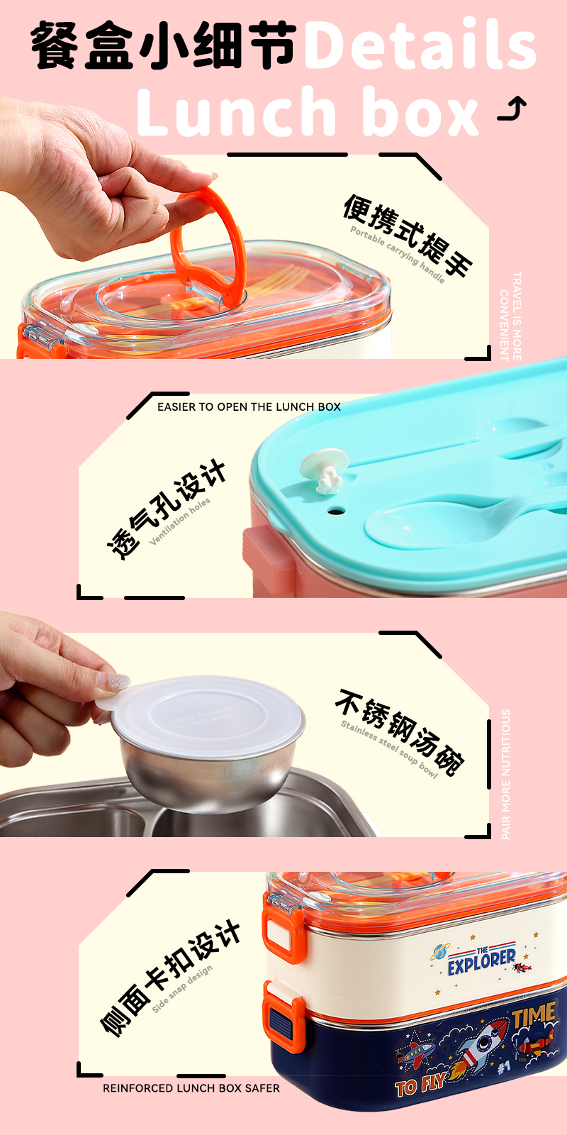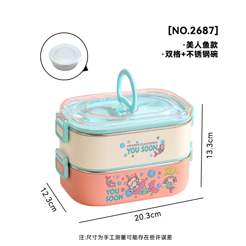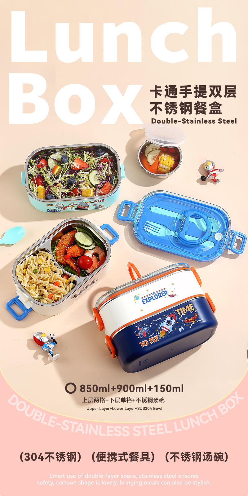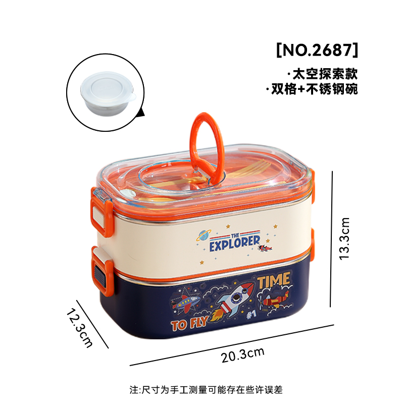 2687-Double-STAINLESS STEEL lunch box(SUS304+ 800ml+900ml+SUS304 BOWL 150ml+PP SPOON FORK)