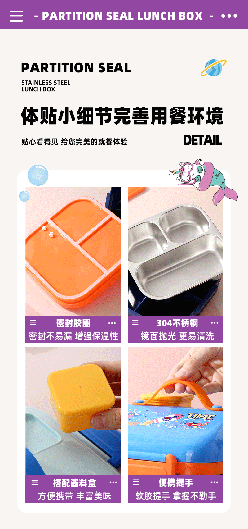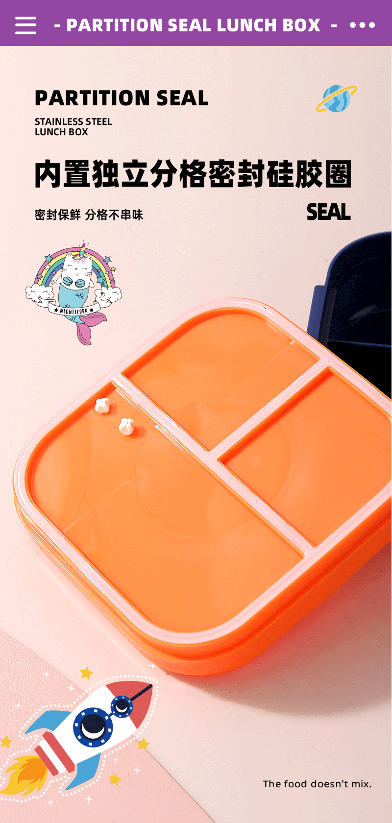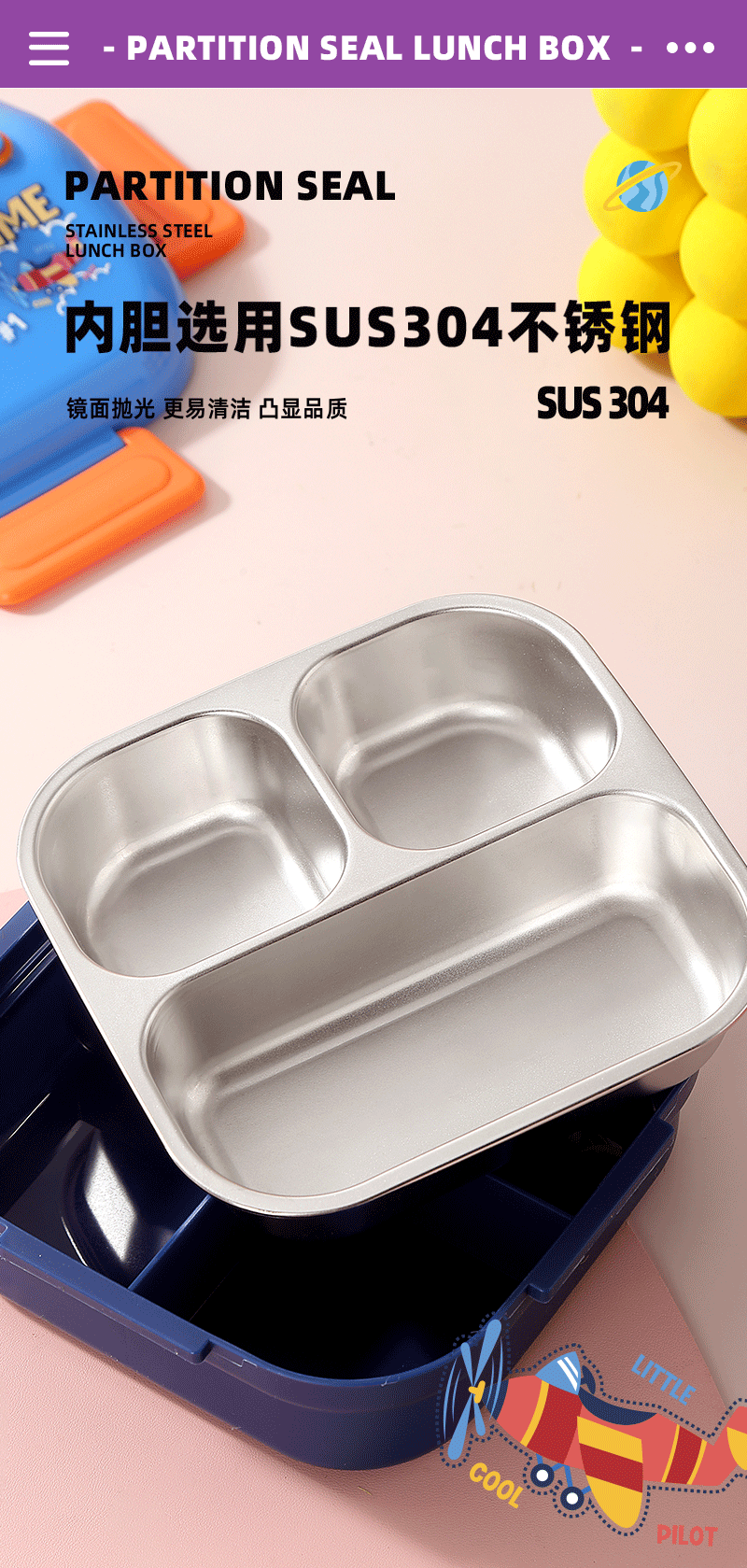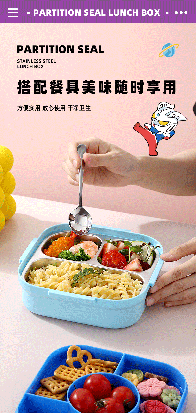 2688-FOOD NOT MIX HOUSE STAINLESS STEEL lunch box(SUS304+3 GRID 700ml+bowl 70ml+SUS SPOON)